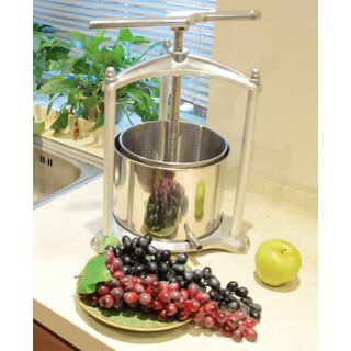 Klassische Edelstahl-Spindelpresse 6 Liter Korbvolumen. Diese kleine Fruchtpresse ermöglicht einfachstes Pressen von Beeren, Kräutern, Obst und Gemüse zum Hausgebrauch.
