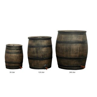 Die Regentonne in täuschend echter Holzfass-Optik ist witterungsbeständig und frostsicher. Einfach Montage mit gängigen "Regendieben" am Dachrohr.